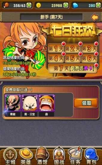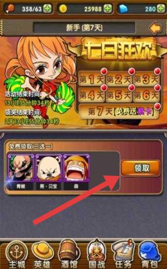 1、在“七日狂欢”第7天,点击【领取】,选择青雉、熊·贝波、乔巴其一,获取免费角色,增强阵容。