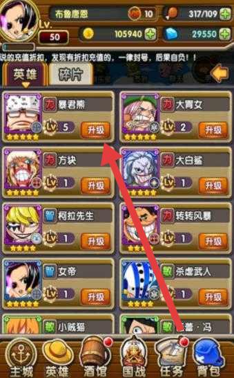 2、进入英雄界面,选“暴君熊”等角色,点击【升级】,消耗资源提升等级,强化战力,备战冒险。