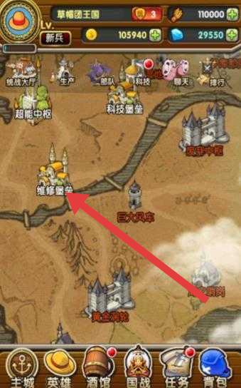 3、打开地图,前往“维修堡垒”,参与据点玩法,完成任务、挑战敌人,推进“草帽团王国”剧情。