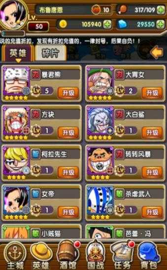2、英雄养成系统:升级英雄等级、穿戴装备提升属性,解锁专属技能树,打造个性化战力核心,应对多样化的海域挑战。