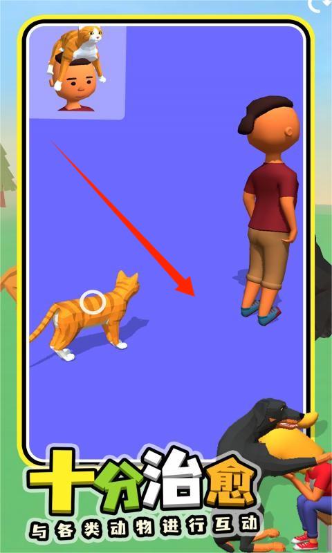 1、拖动动物到人物身边,让动物与人物互动,比如将猫放到人头顶等操作。