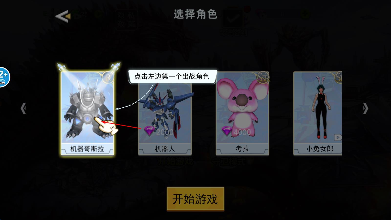 1、进入游戏,从多种超级怪兽中选择操控角色,踏入像素风格的城市,点击屏幕控制怪兽移动,开启首次破坏之旅。