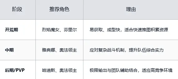 1、开荒期:优先培养【烈焰魔女】(法师/爆发,地狱火持续灼烧引爆伤,适配日常副本/BOSS战,新手20抽保底获取)与【芬里尔】二者易成型,助力快速推图积累资源。