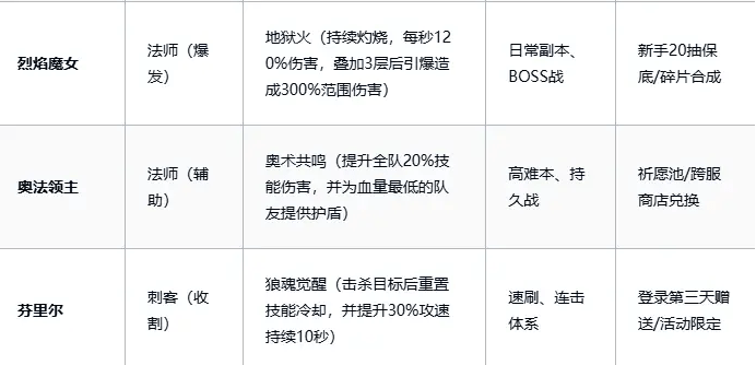 1、烈焰魔女(法师·爆发):核心技能为地狱火,每秒造成120%灼烧伤害,叠满3层后引爆,造成300%范围伤害,定位日常副本、BOSS战攻坚,依赖持续伤害与爆发衔接。