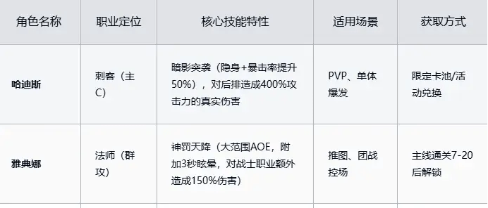 3、后期/PVP(竞争适配):推荐哈迪斯、奥法领主,哈迪斯(刺客主C)从限定卡池或活动兑换获取,暗影突袭可隐身并提升50%暴击率,对后排造成400%攻击力的真实伤害。