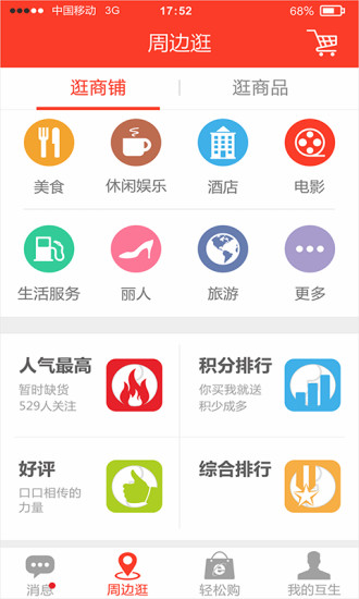 周边逛:用于查询用户周边可以使用“互生积分卡”的商铺及其商品等。