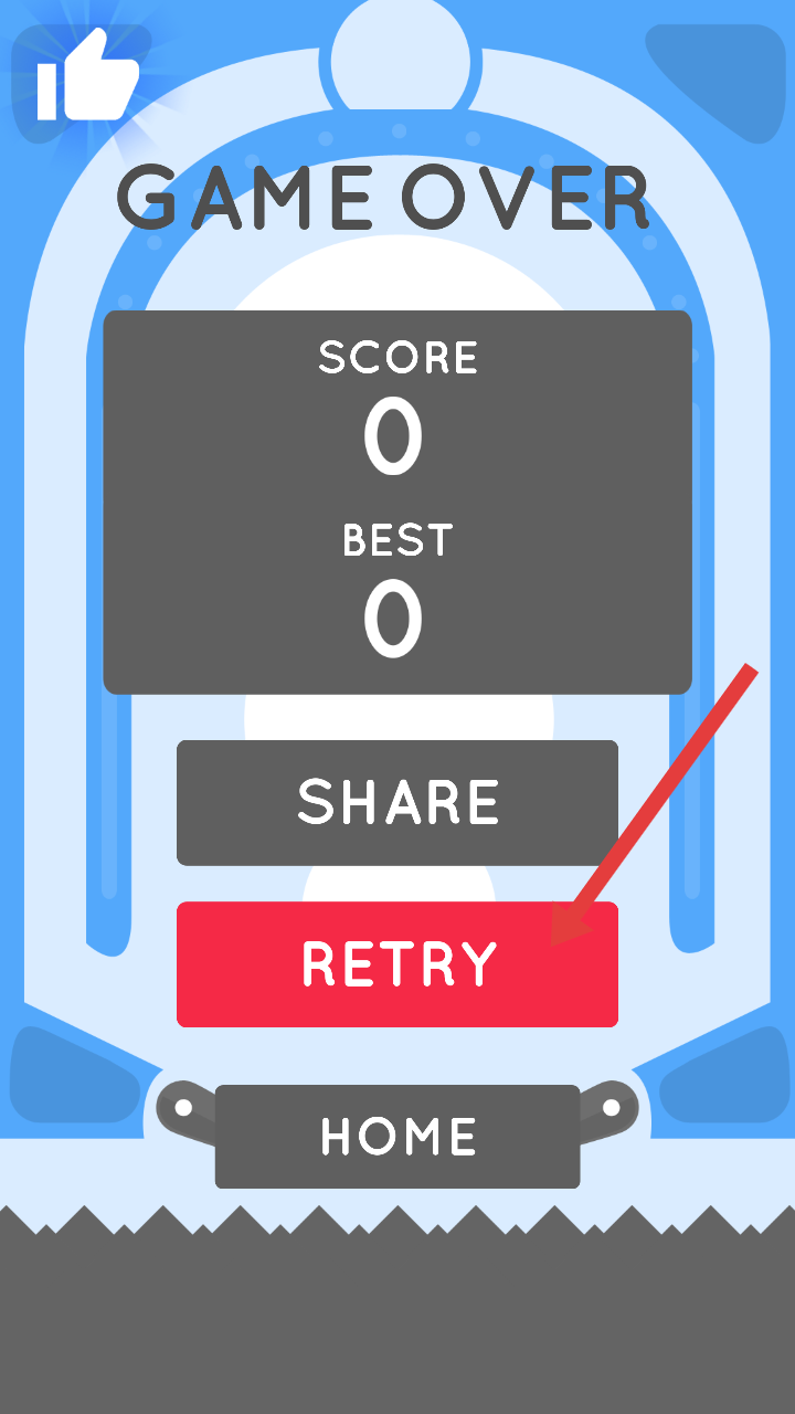 2、游戏失败后,界面显示【GAMEOVER】,点击红色【RETRY】按钮,可立即重新挑战,再次尝试突破。