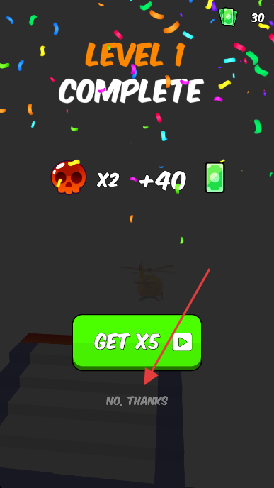 3、关卡完成后,点击【NO THANKS】,跳过广告,结束本关。