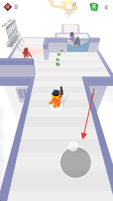 2、操控箭头指向的圆形区域,移动角色,射击敌人。