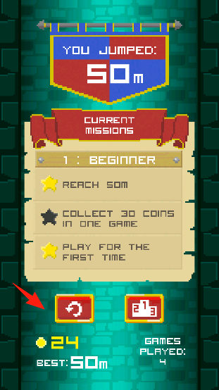 3、结算界面,点击红箭头指向的重玩按钮,重复挑战,完成任务(如REACH50m),积累金币(24)。