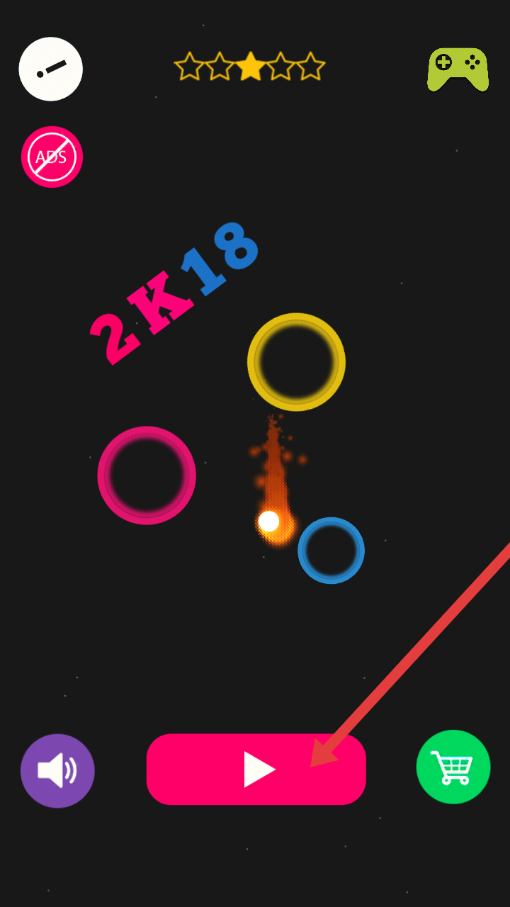 1、进入无限弹球2k18的游戏主界面,点击底部粉色播放按钮,开启主题的圆环射击冒险。