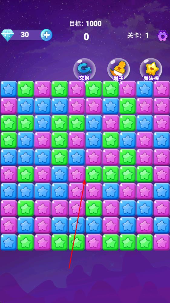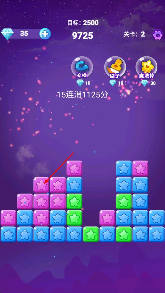 1.选择经典模式开启首关,屏幕中随机分布不同颜色星星,点击两个及以上相同颜色星星即可消除,积累分数达到目标值即可过关。