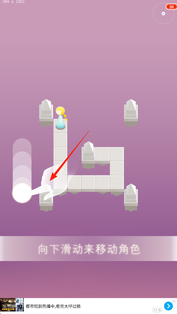 2、按指引向下滑动屏幕,让角色在方块间向下移动,规划路线覆盖更多方块。