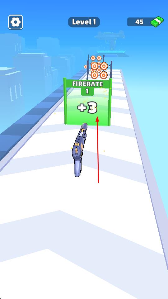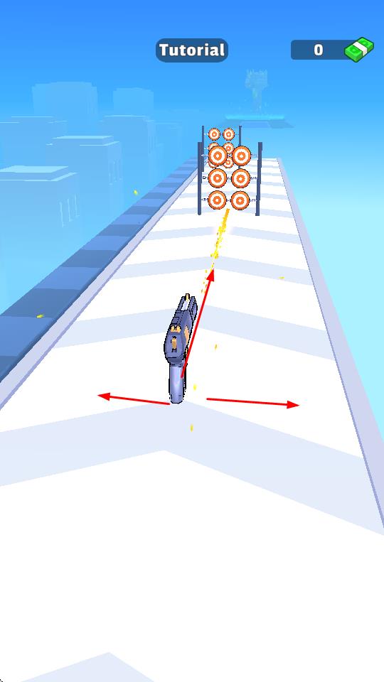 1、操控枪支在跑道移动,左右滑动调整位置,自动射击目标,命中得分推进关卡,躲避或击碎障碍。