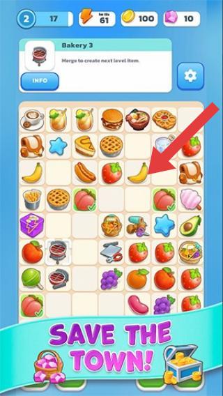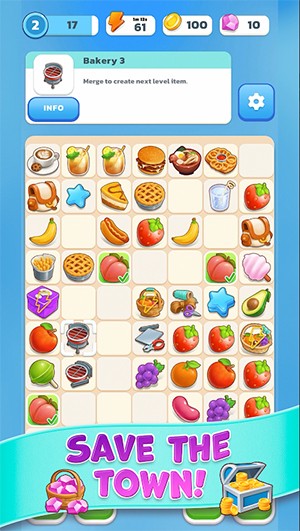 1、呈现通过合并消除、升级物品推进关卡,达成拯救小镇目标的玩法,符合连连看消除+经营拯救主题的休闲游戏逻辑。