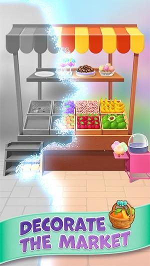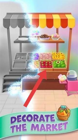 3、摊位(有甜品、果蔬陈列)、色彩特效(闪电状装饰光效),呈现通过装饰升级市场摊位的环节,属于经营+装饰玩法的休闲内容。