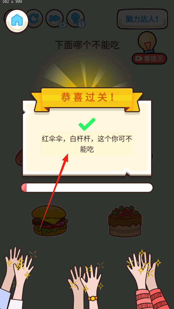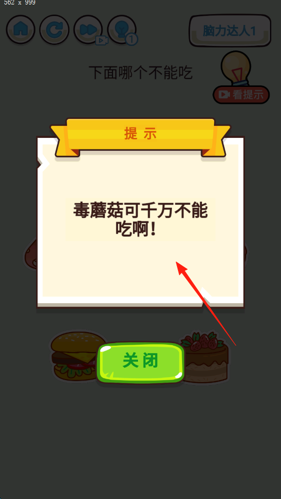 2、若不确定答案,点击看提示,根据提示内容,找到不能吃的物品并点击。