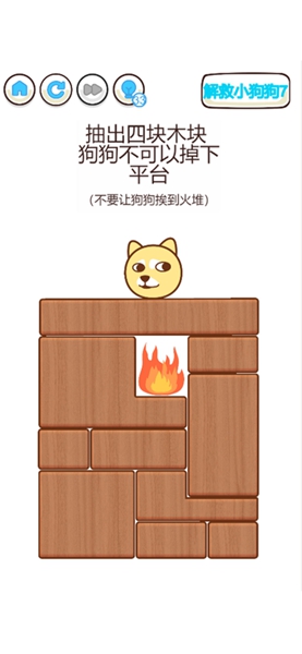 3、物理解谜解救萌宠:解救小狗狗环节需轻轻抽出积木块,在不触碰火焰的前提下营救援生通道,利用物理平衡原理规划抽积木顺序,兼具趣味性与策略深度。