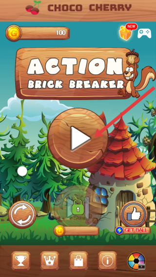 1、进入动作砖破碎机游戏的主界面后,需要点击中间木质播放按钮,开启砖块消除的冒险。