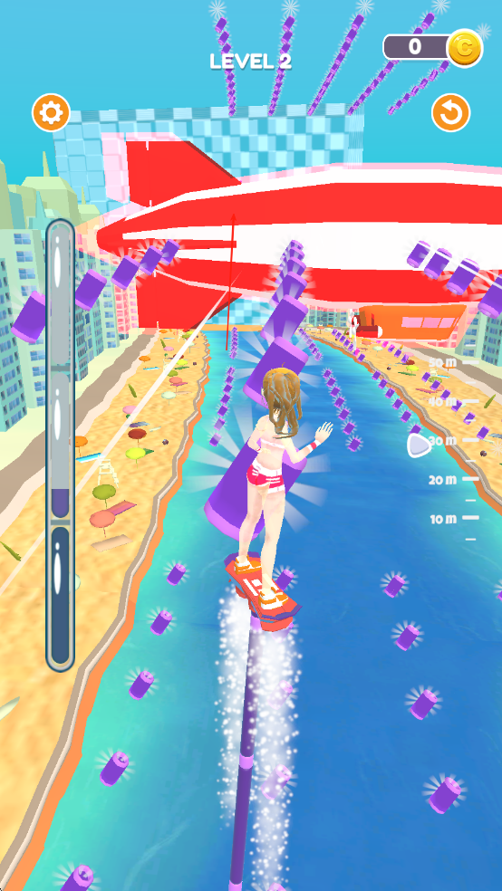 飞板比赛是一款以未来科技为背景的休闲跑酷佳作,玩家将操控悬浮飞板在色彩斑斓的科幻赛道上极速前进,通过灵活调整飞行高度与方向躲避障碍,收集金币与能量道具,挑战更远距离与更高分数,采用极简低多边形画风,打造星际峡谷、霓虹都市、量子空间等主题场景,赛道中分布着旋转激光柱、浮动陨石群、重力断层带等障碍。