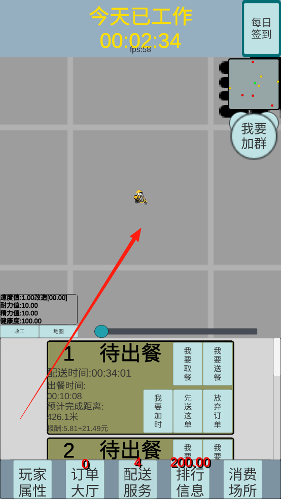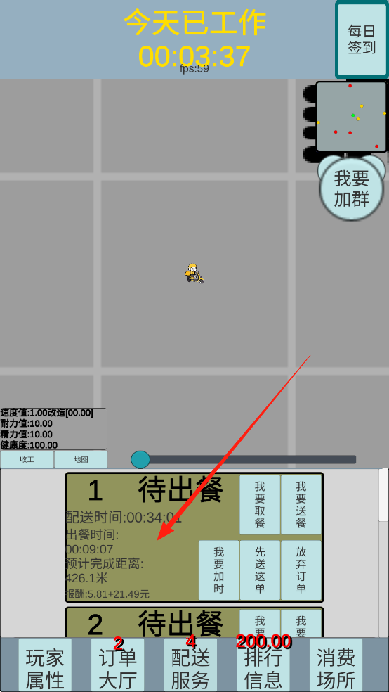 3、突发状况应对:配送途中触发商家出餐延迟、客户地址变更等事件,通过对话框选择协商方案,妥善处理可获得额外信誉值奖励,处理不当将影响服务评分。