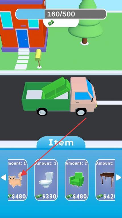 3、在街道场景,选择物品(如猫咪、家具),用卡车运输,送达后获取收益,用于拓展业务。