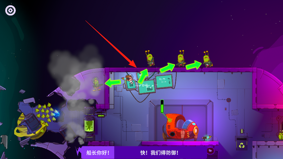 3、移动角色,利用武器攻击来袭敌人,按箭头提示路线,灵活转移防御阵地。