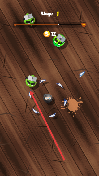 3、战斗场景,操控忍者,沿箭头方向移动,攻击绿色水果敌人,收集金币(如$12),推进关卡。