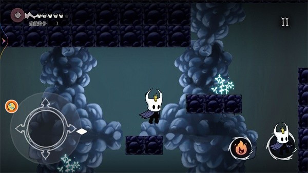 1、操控主角(小骑士),遇敌人(如上图怪物),点击攻击键(红箭头),用骨钉战斗。