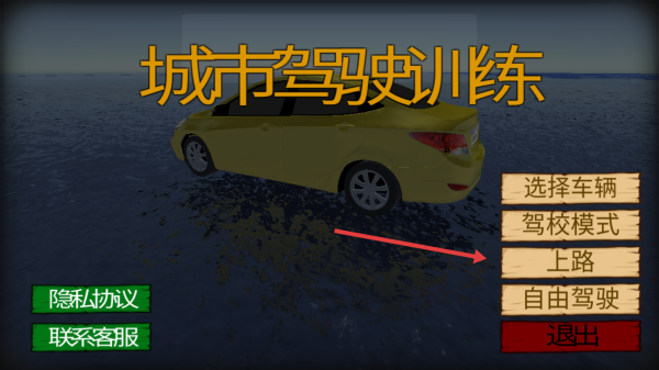 1、选【上路】模式,驾驶黄色轿车,进入城市道路。