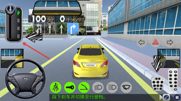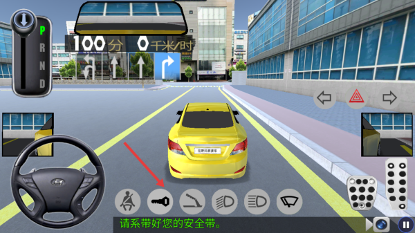 2、按提示:点安全带、钥匙图标(启动),踩刹车切“D档”,握方向盘控方向。