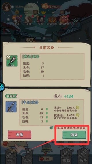 3、随着获得更高品质的装备,你可以替换旧的并将其出售。