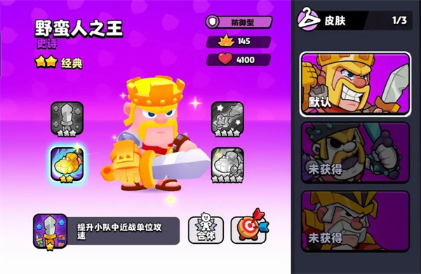 1、野蛮人之王:史诗品质,等级145,生命值4100,定位防御型,技能可提升小队近战单位攻速,皮肤含默认等3款(1/3解锁),作为团队前排,靠增益buff强化近战协同。