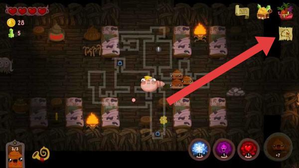 2、在地牢场景,点击箭头指向的地图/任务道具(右上角),查看关卡布局、目标,规划探索路径。