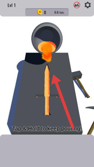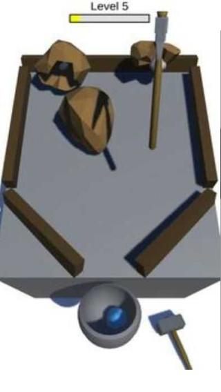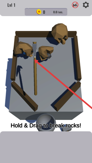 2、进入Lv1采矿环节,场景为简易工作台,按提示,长按并滑动锤子,用力砸向棕色岩石堆,击碎后收集矿石,为铸剑储备材料。