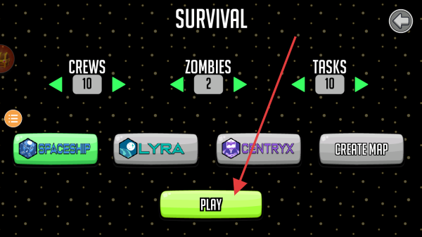 2、在生存模式(SURVIVAL),设“CREWS10”“ZOMBIES2”“TASKS10”,选地图(如SPACESHIP),点“PLAY”开始,应对僵尸、完成任务。