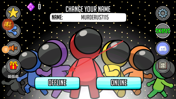 1、主界面选“ONLINE/OFFLINE”进入模式,确认名字“MURDERUS7115”,点“SKINS”可换外观,准备开局。