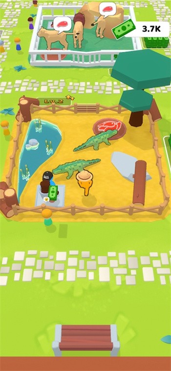 2、呈现动物园场景,有鳄鱼等动物、角色、资源等,玩家可进行动物园经营管理,如照料动物、规划展区等。