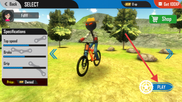 2、进入【SELECT】界面,查看自行车【Specifications】,确认后点【PLAY】,开启骑行。
