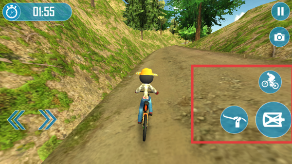3、在山地赛道,借方向键控角色骑行,避障碍,按时间推进,冲过终点,完成关卡挑战。
