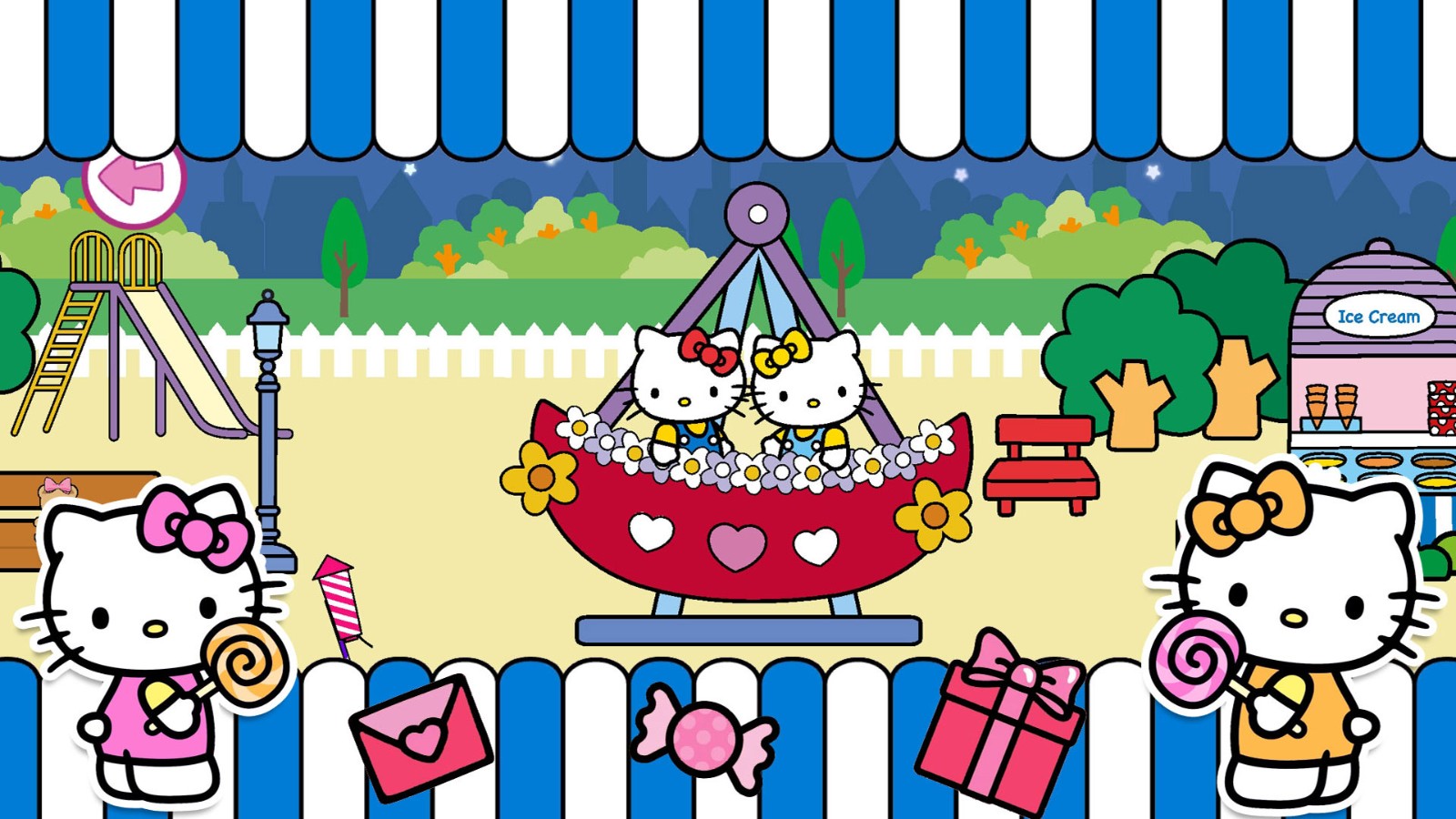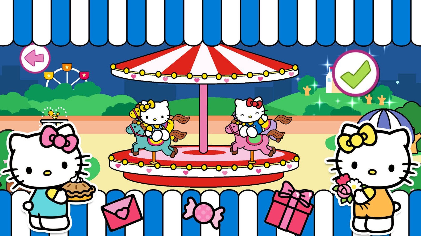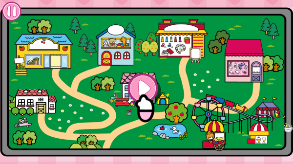 1、有凯蒂猫角色、凯蒂猫形象的店铺(展示糕点、水果等商品),属于儿童向、休闲类的凯蒂猫主题,玩法可能围绕店铺经营、互动体验展开。