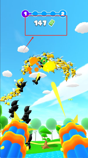 1、游戏开始后注意左上角红框标注的分数147,操控角色移动躲避蜂群,同时瞄准射击黄色蜂群获取分数。