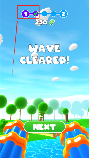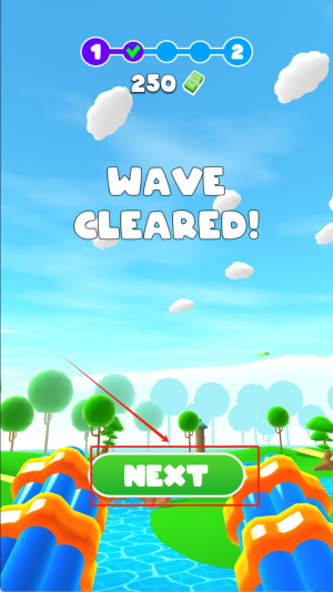 2、完成当前波次后,画面显示"WAVE CLEARED!"和250分奖励,点击绿色"NEXT"按钮进入下一波挑战。