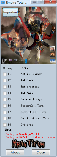 帝国全面战争修改器是专为同名游戏《帝国:全面战争》的作弊器。通过修改器,玩家可以获得无限的金钱,可以无限生成军队,还可以让研究、招募、建筑都变成一回合完成,让你有更多的时间去攻击敌人,让游戏变的更刺激!