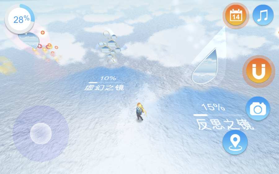 天空之镜漫步构建小清新风格的休闲冒险舞台,驾驶者操控角色踏入如天空之境的盐沼场景,通过操纵杆控制移动轨迹收集正能量,可进入反思之镜破解迷宫避开负能量、在虚幻之镜挑战左右脑反向操控穿越障碍、于净化之镜快速获取能量,在梦幻般的镜像世界中体验解谜与收集的乐趣。