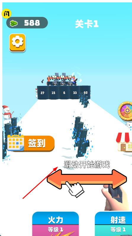 1、进入游戏后操控初始手枪角色,在关卡中射击敌人前进,收集沿途金币与道具奖励。