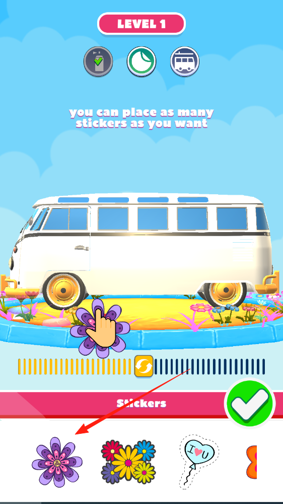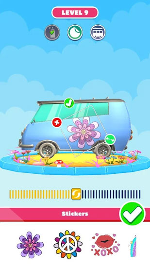 2、进入贴纸环节,挑选贴纸(如花形),拖动贴在车身,装饰车辆外观。