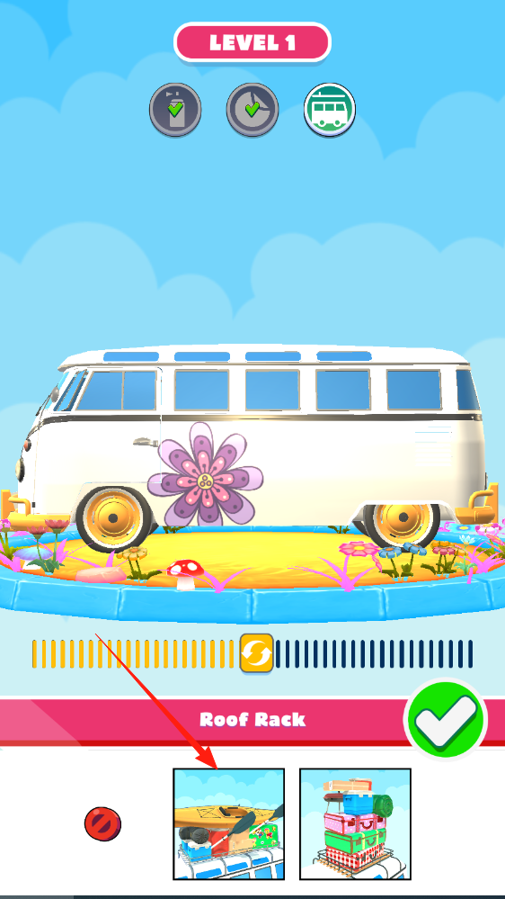 3、最后选车顶架样式,放置到车顶,完成所有改装步骤,解锁新关卡。