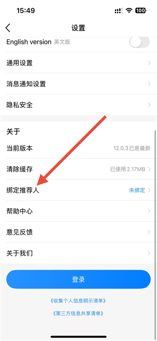 3、在设置页面里,选择绑定推荐人选项并点击,进入绑定推荐人的信息填写页面。