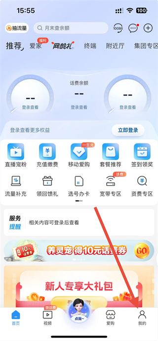 1、打开中国移动app,点击首页界面我的选项,进入个人页面。